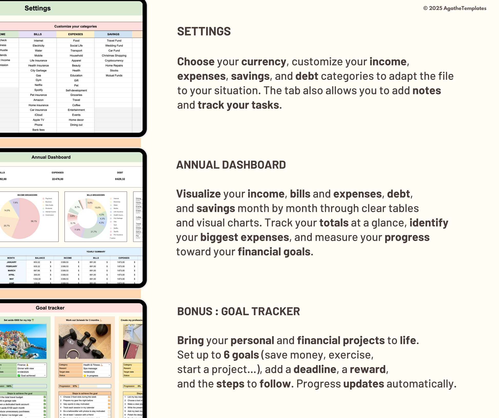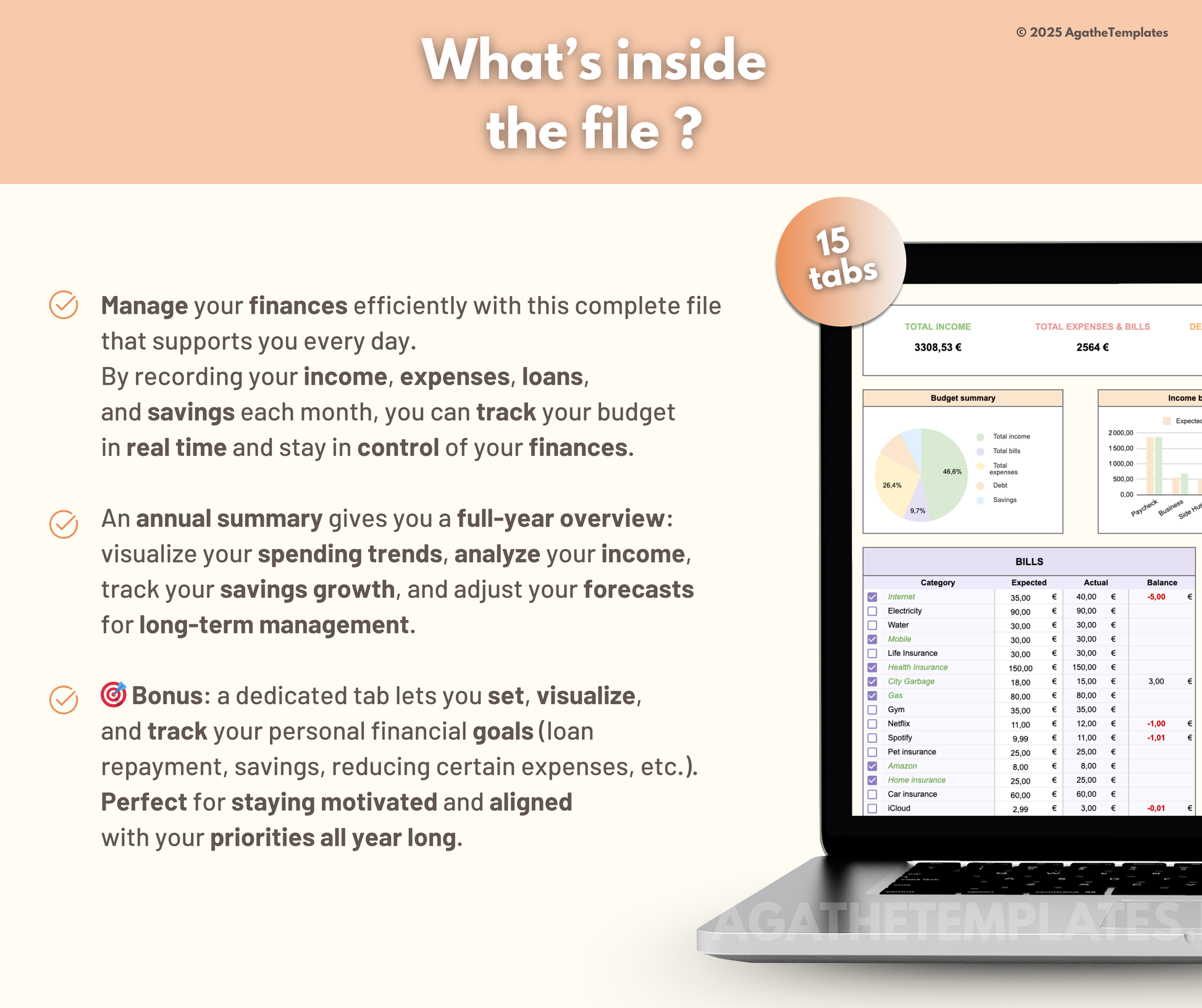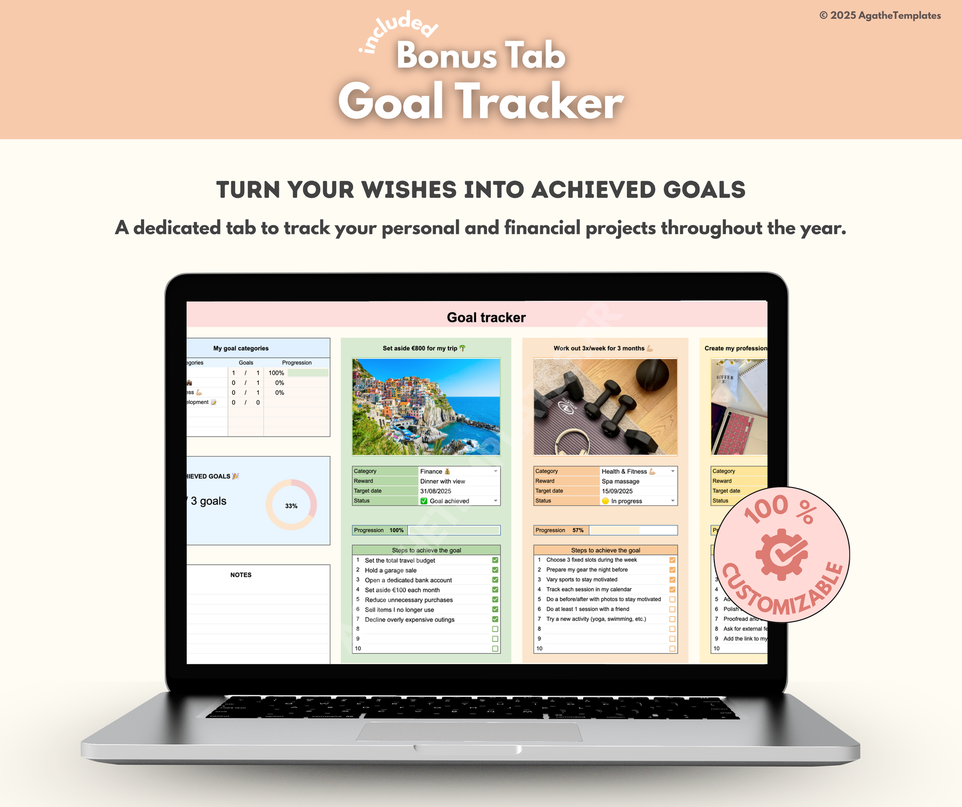 Designed to simplify your financial management, this tool allows you to track your expenses, income, bills, and savings all in one place. With this all-in-one tracker, take control of your finances month after month and achieve your annual goals.