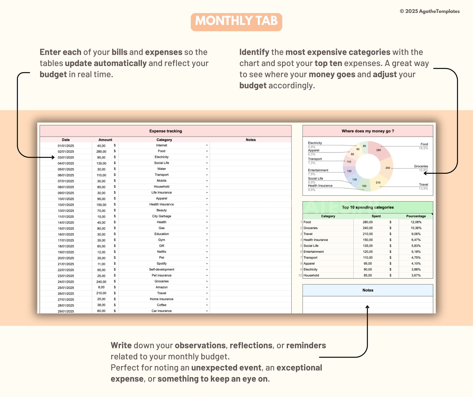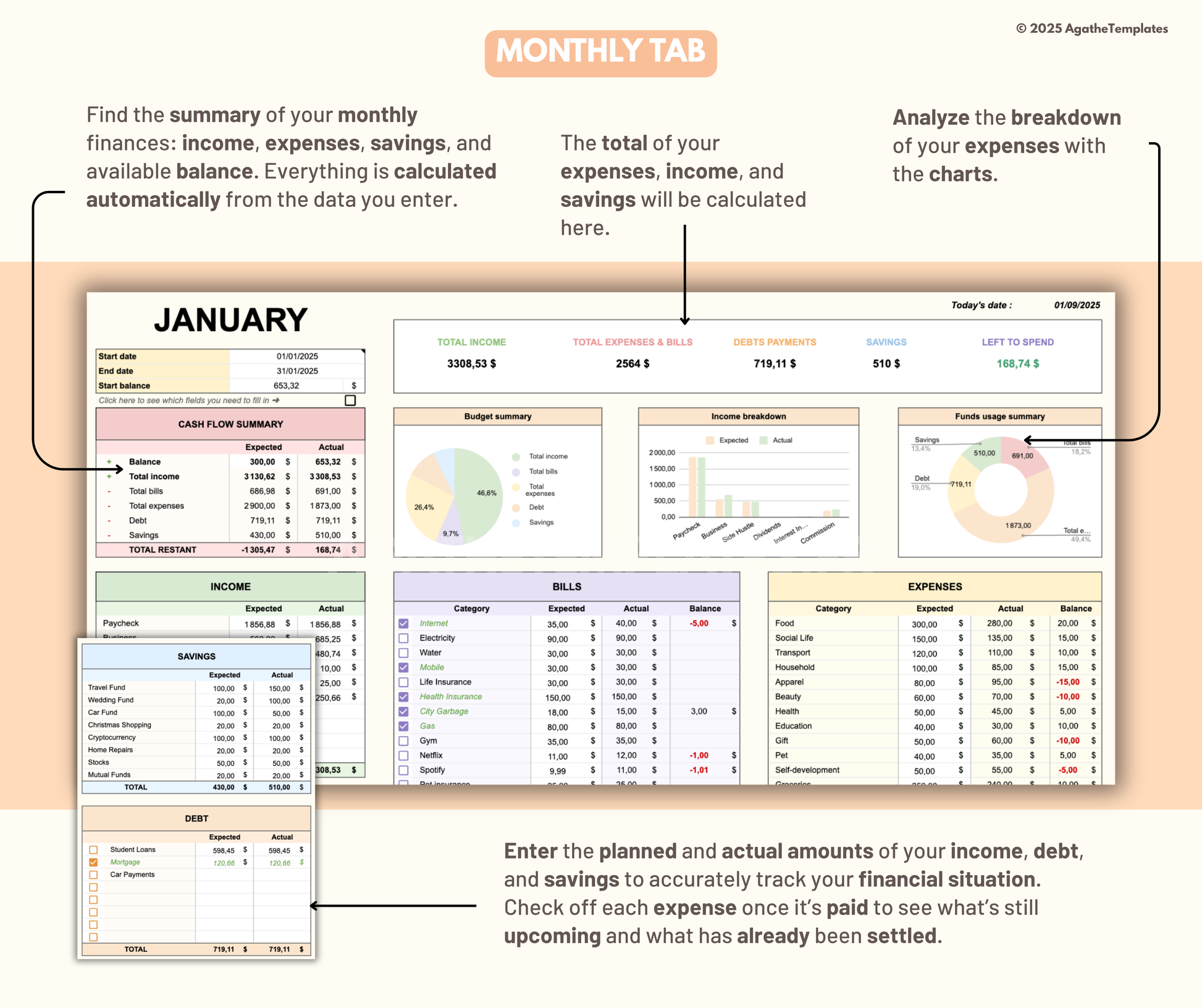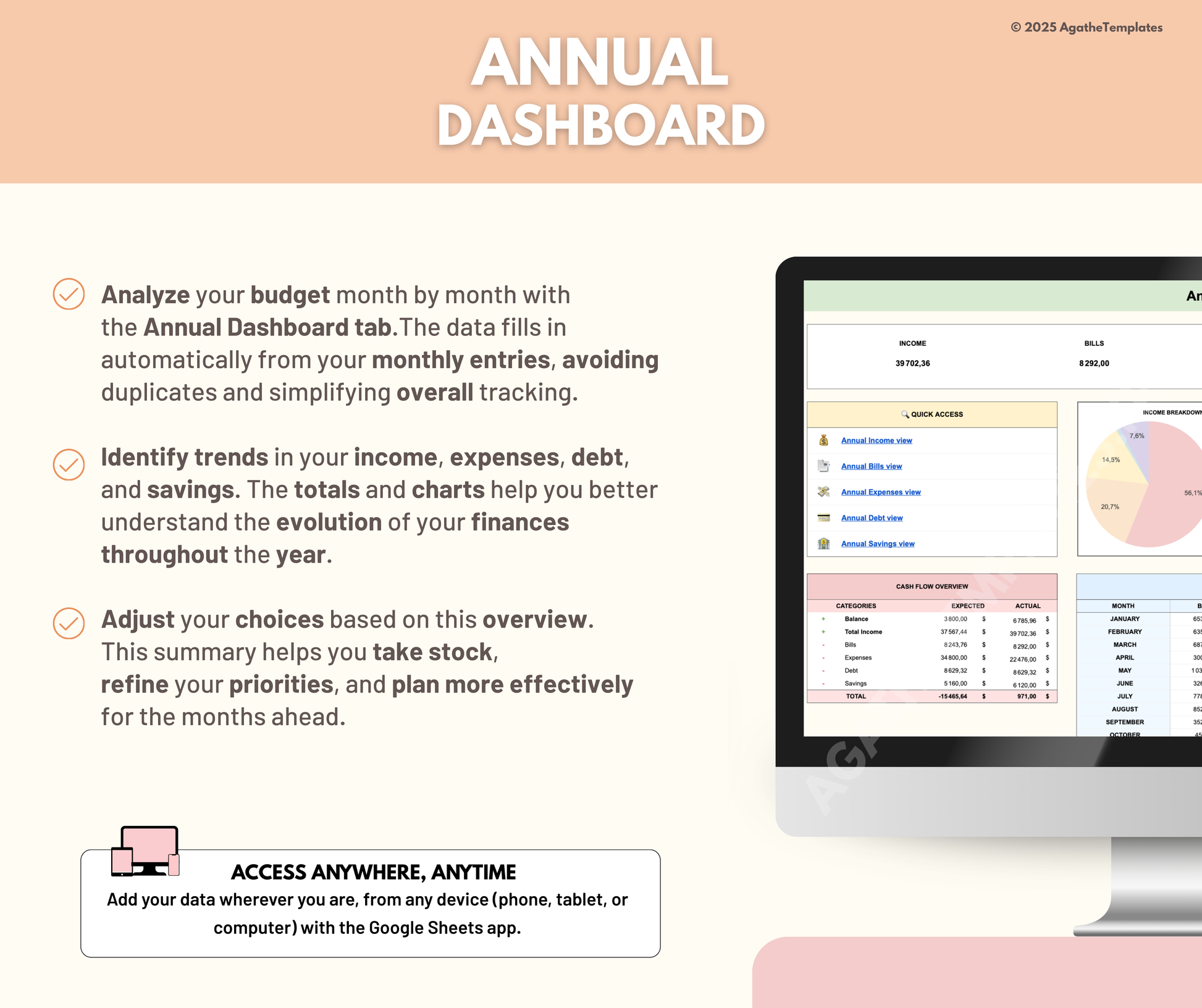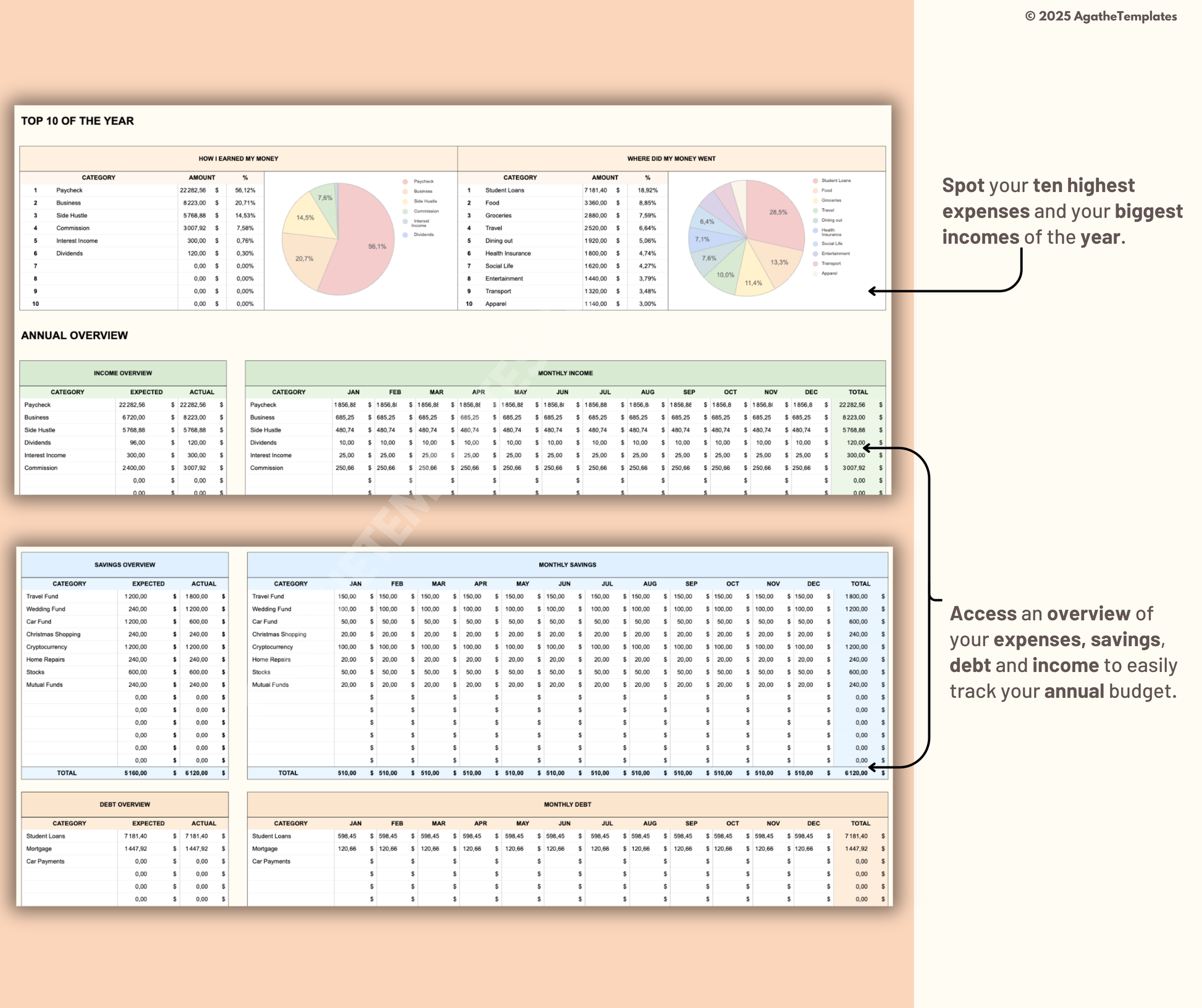 Designed to simplify your financial management, this tool allows you to track your expenses, income, bills, and savings all in one place. With this all-in-one tracker, take control of your finances month after month and achieve your annual goals.