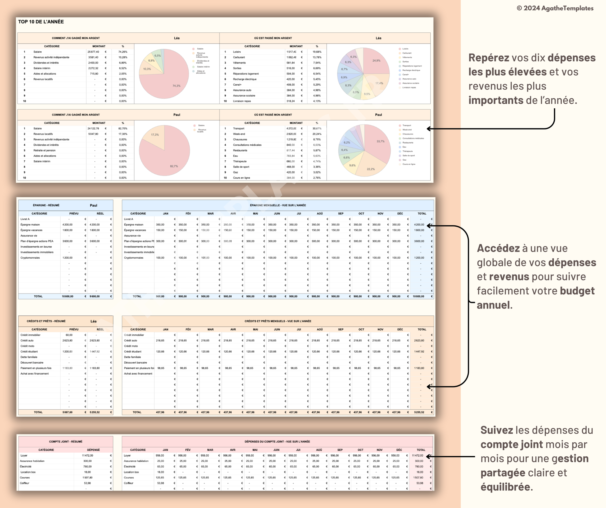 Un tableau récapitulatif annuel vous permet de suivre l’évolution de vos finances à deux sur 12 mois. Des graphiques intégrés vous aident à analyser vos habitudes, détecter les postes de dépense importants et ajuster vos priorités.