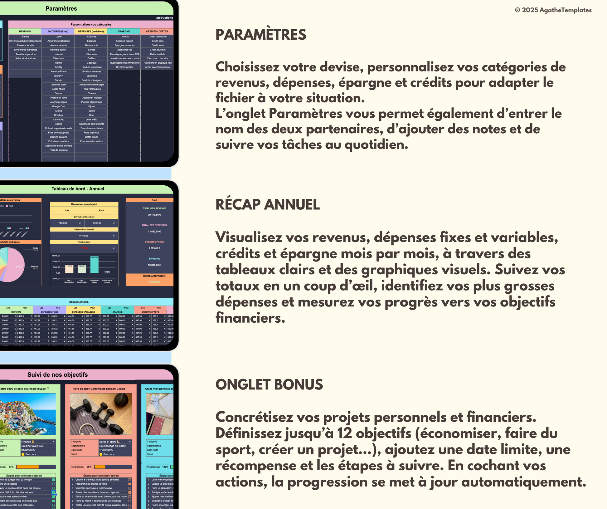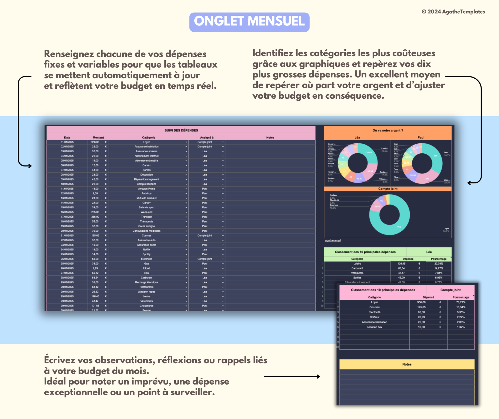 Conçu pour simplifier la gestion financiĂšre Ă deux, cet outil vous permet de suivre sĂ©parĂ©ment vos dĂ©penses personnelles et celles du compte commun. GrĂące Ă ce tracker tout-en-un, gardez une vision claire et centralisĂ©e de lâensemble de vos mouvements financiers mois aprĂšs mois, et atteignez vos objectifs annuels ensemble.