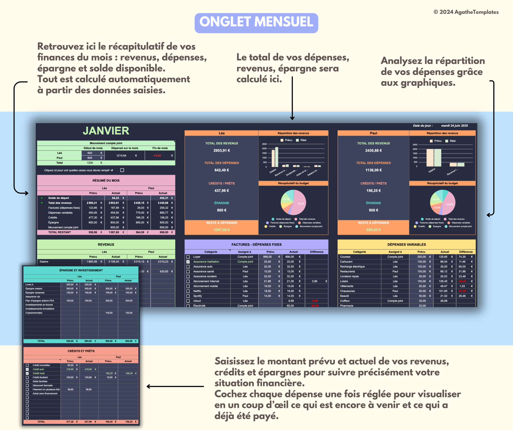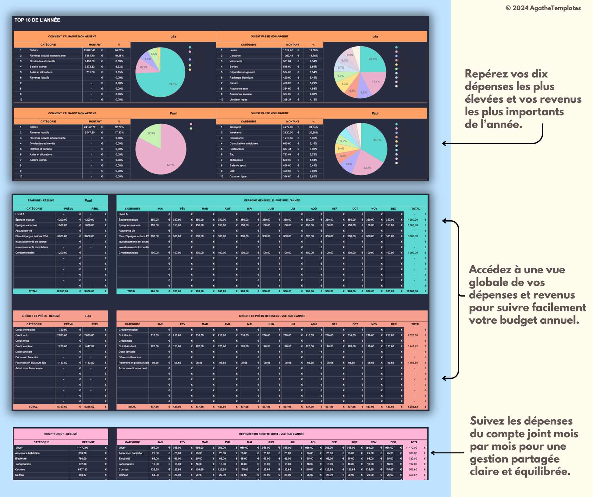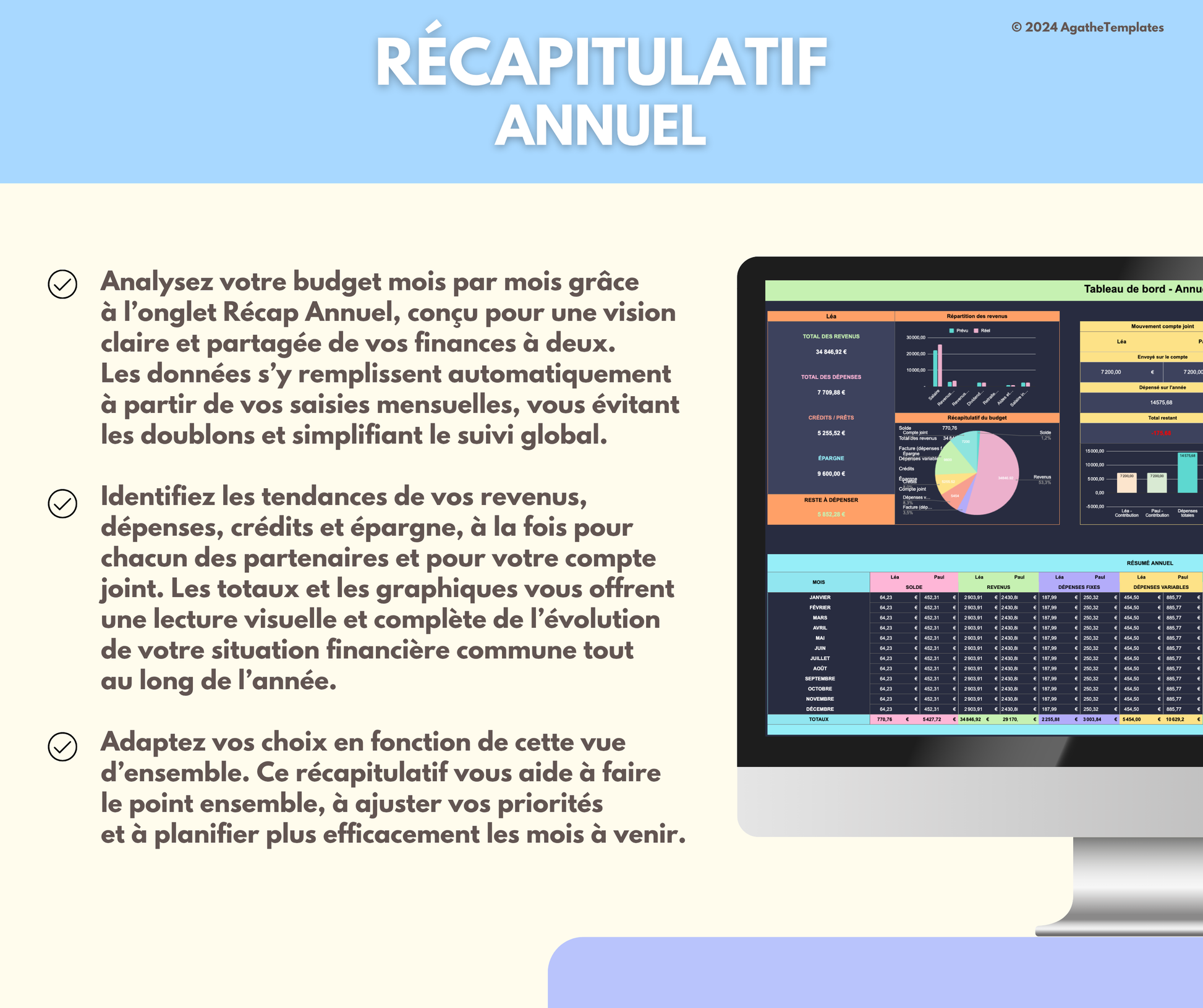 Un tableau rĂ©capitulatif annuel vous permet de suivre lâĂ©volution de vos finances Ă deux sur 12 mois. Des graphiques intĂ©grĂ©s vous aident Ă analyser vos habitudes, dĂ©tecter les postes de dĂ©pense importants et ajuster vos prioritĂ©s.