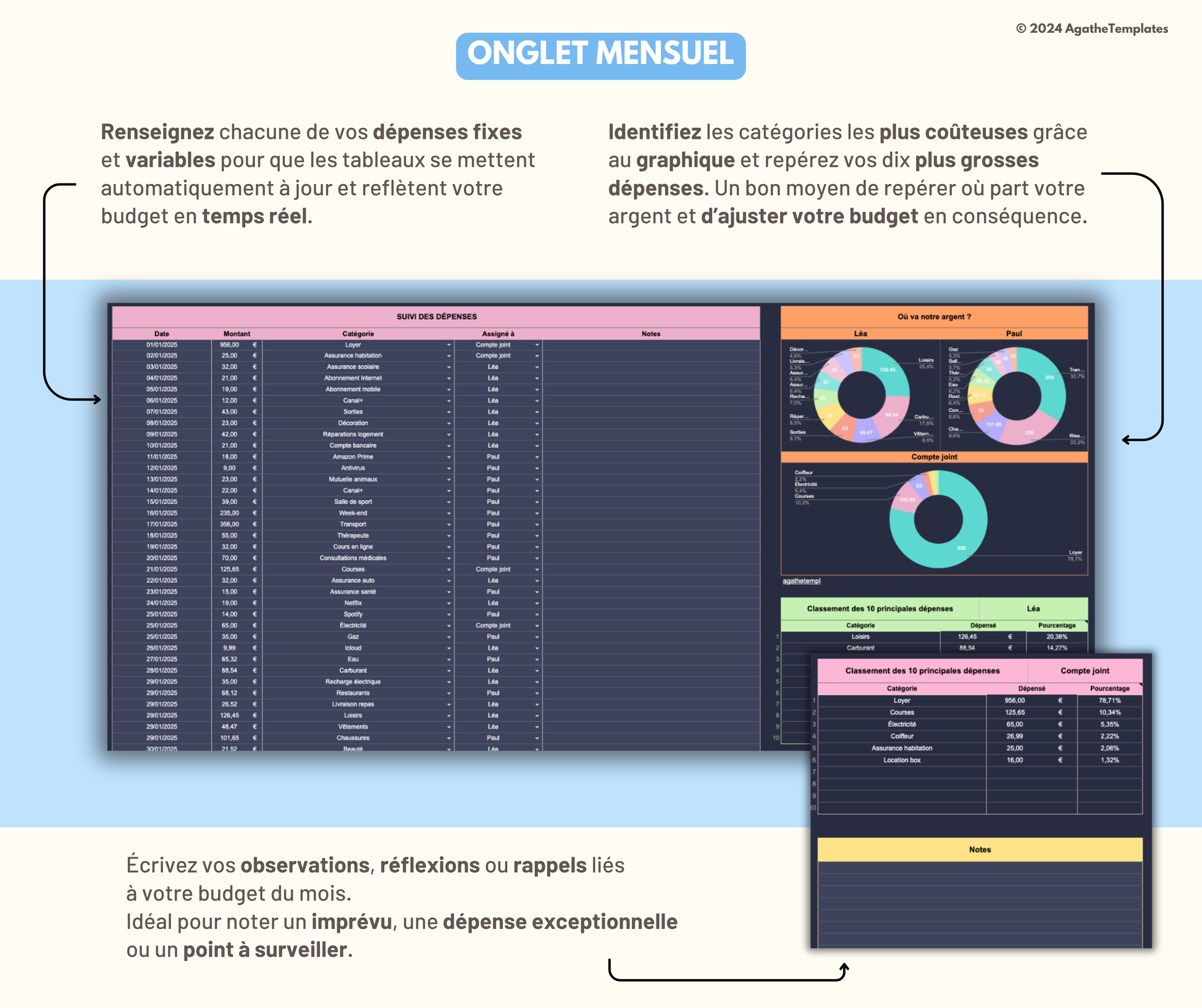 Conçu pour simplifier la gestion financière à deux, cet outil vous permet de suivre séparément vos dépenses personnelles et, si vous en utilisez un, celles du compte commun. Même sans compte joint, le tracker s’adapte parfaitement : il centralise toutes vos informations pour vous offrir une vision claire de vos finances mois après mois, et vous aider à atteindre vos objectifs annuels ensemble 💪🏼