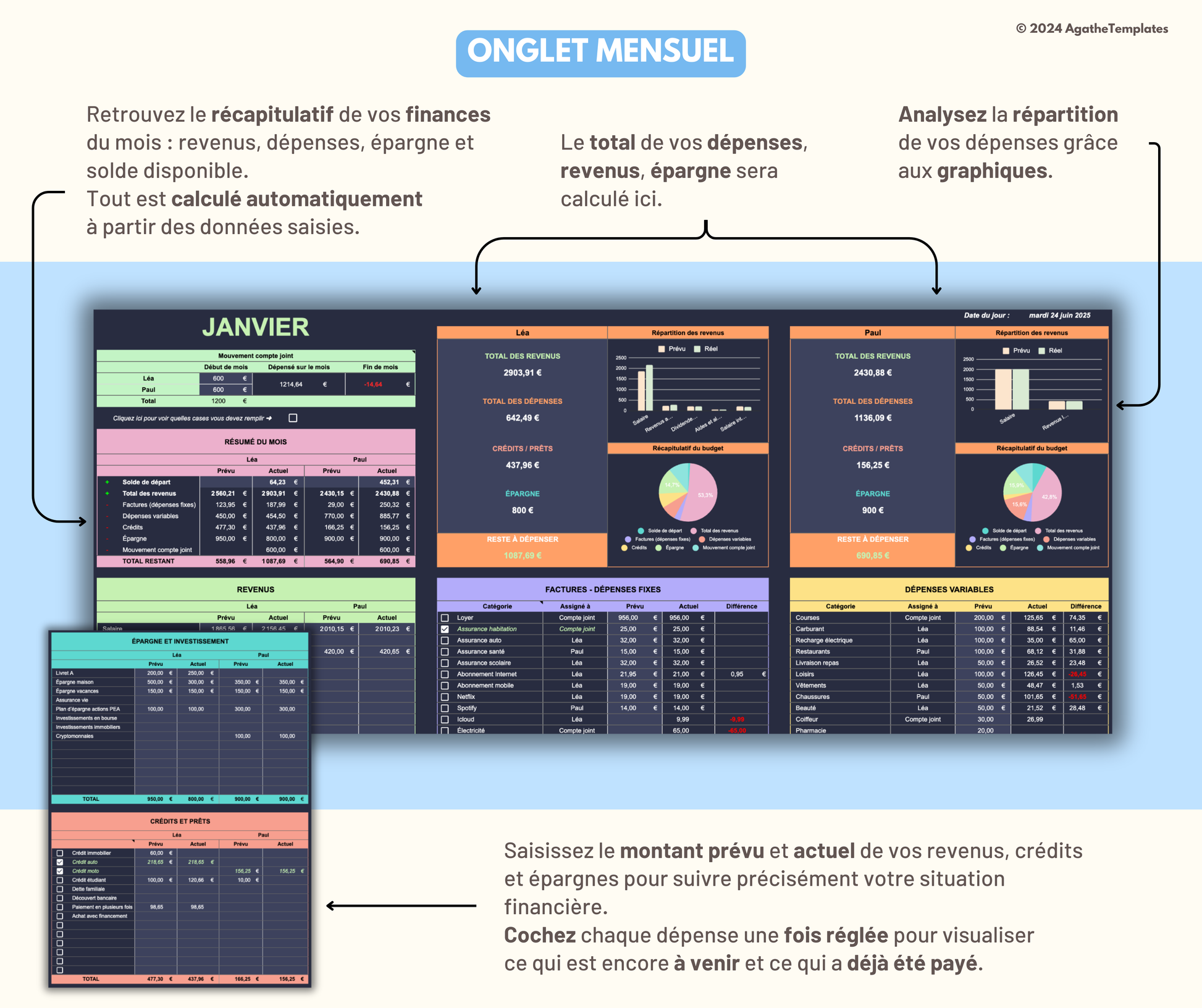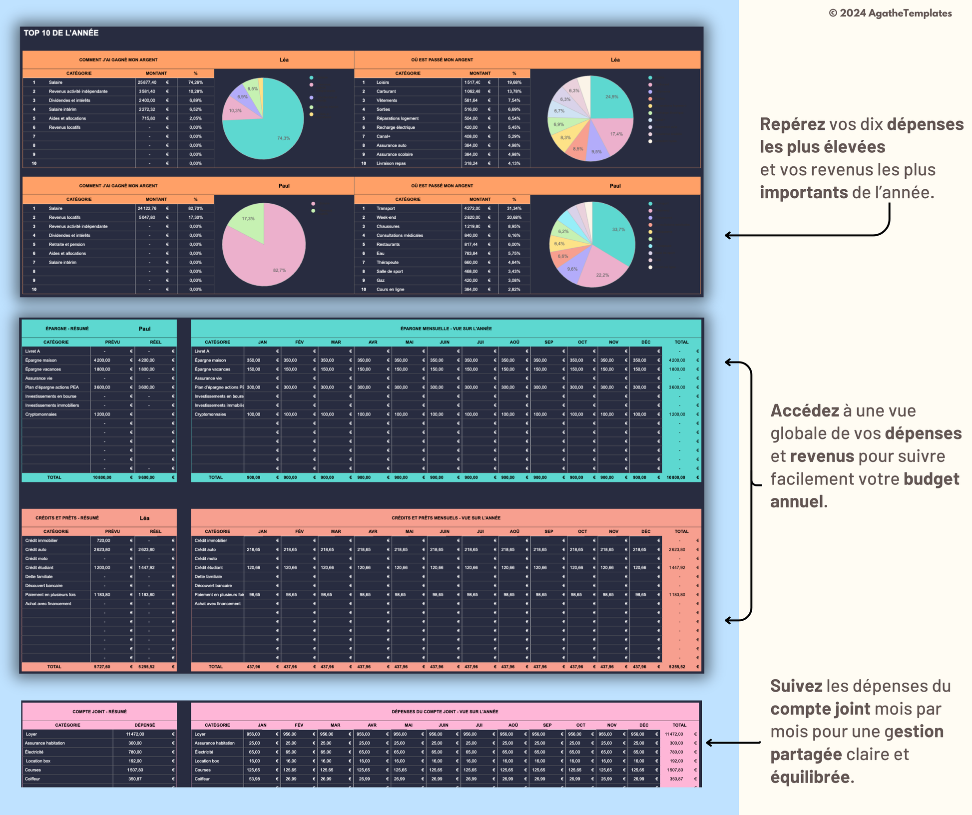 Un tableau récapitulatif annuel vous permet de suivre l’évolution de vos finances à deux sur 12 mois. Des graphiques intégrés vous aident à analyser vos habitudes, détecter les postes de dépense importants et ajuster vos priorités.