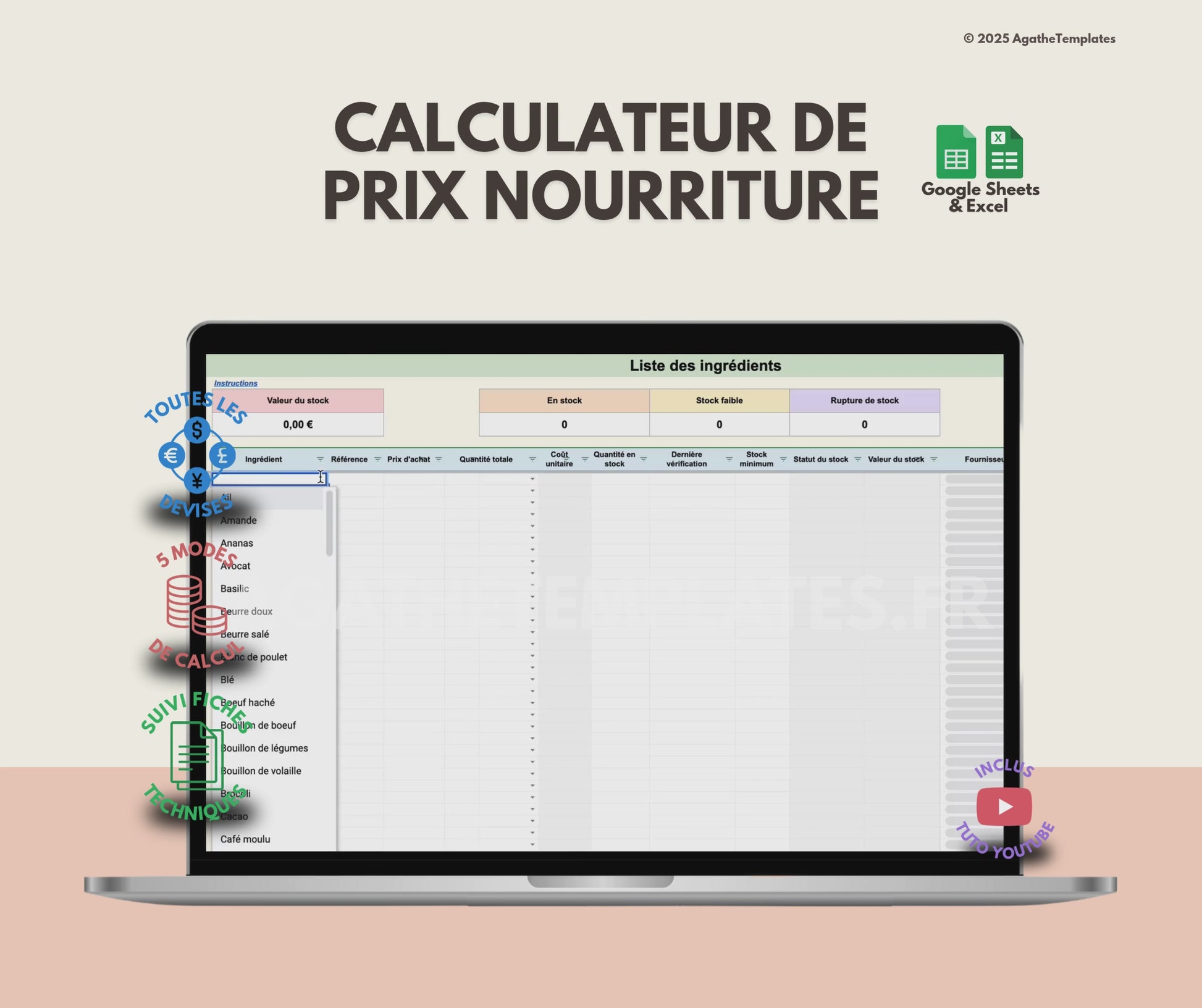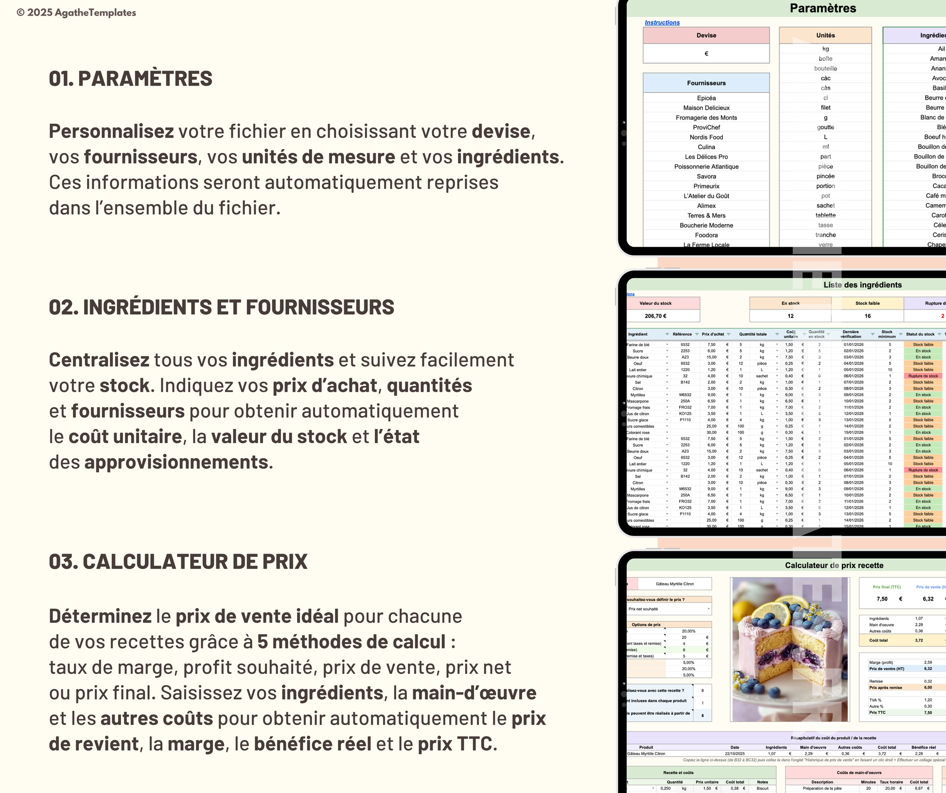 đ„Ł Gestion des ingrĂ©dients : Ajoutez vos produits de base, quantitĂ©s, unitĂ©s, prix, stocks et fournisseurs. Le fichier alerte automatiquement en cas de doublon ou de stock faible.