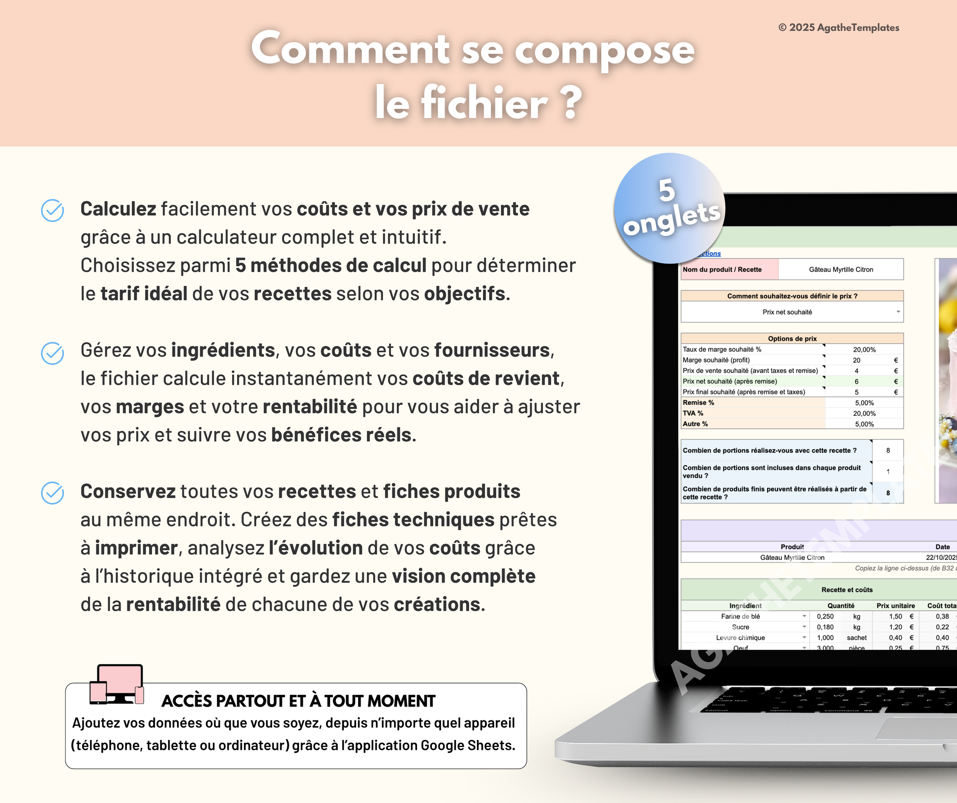 Conçu pour les artisans, traiteurs, restaurateurs, pùtissiers ou créateurs culinaires, ce fichier complet vous aide à déterminer le prix de revient et le prix de vente idéal de vos produits, tout en gardant une trace claire de vos recettes et ingrédients.