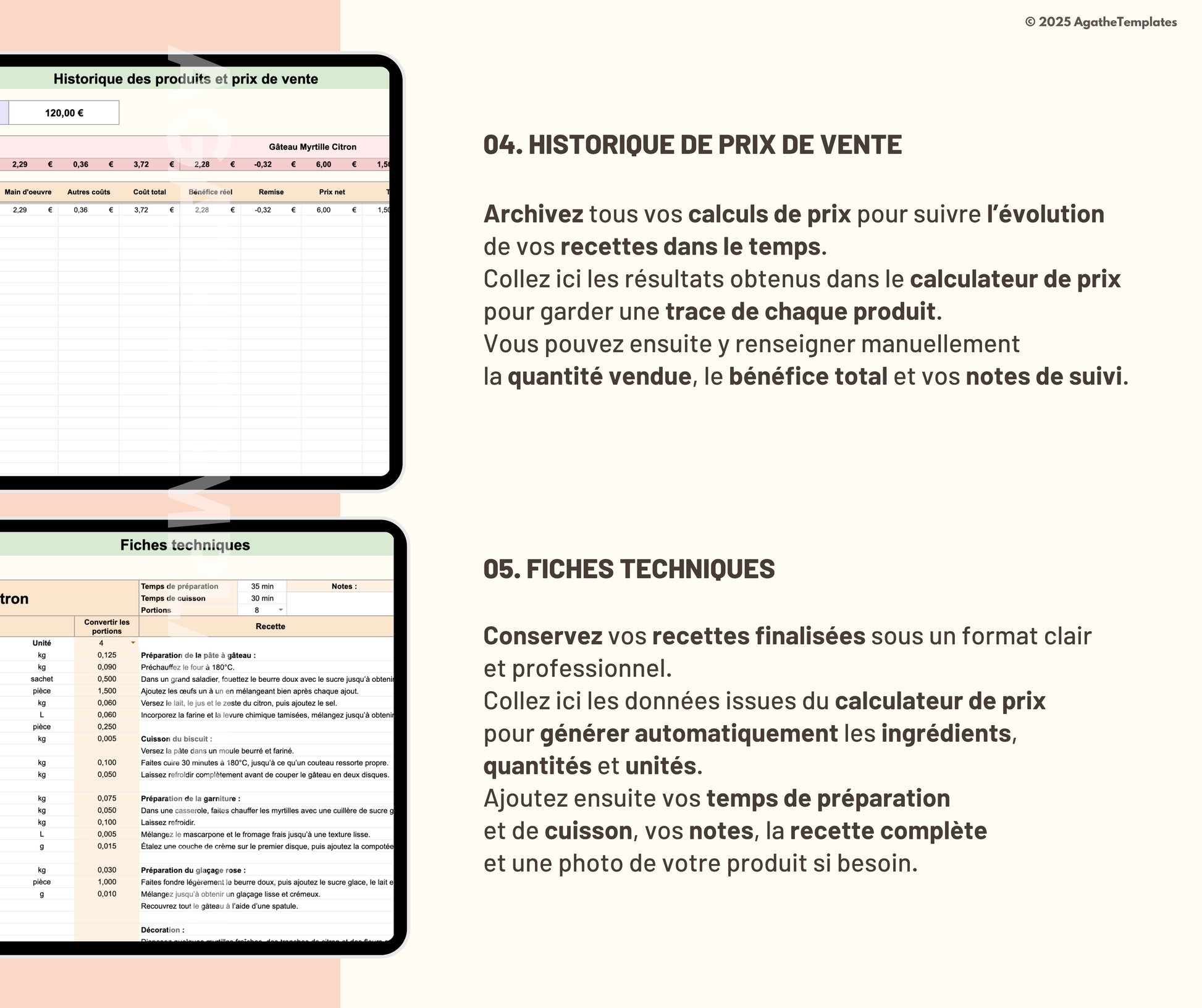 đłÂ Fiches recettes prĂȘtes Ă imprimer : Gardez une trace visuelle et dĂ©taillĂ©e de chaque recette avec ses ingrĂ©dients, quantitĂ©s, coĂ»ts et photo.
