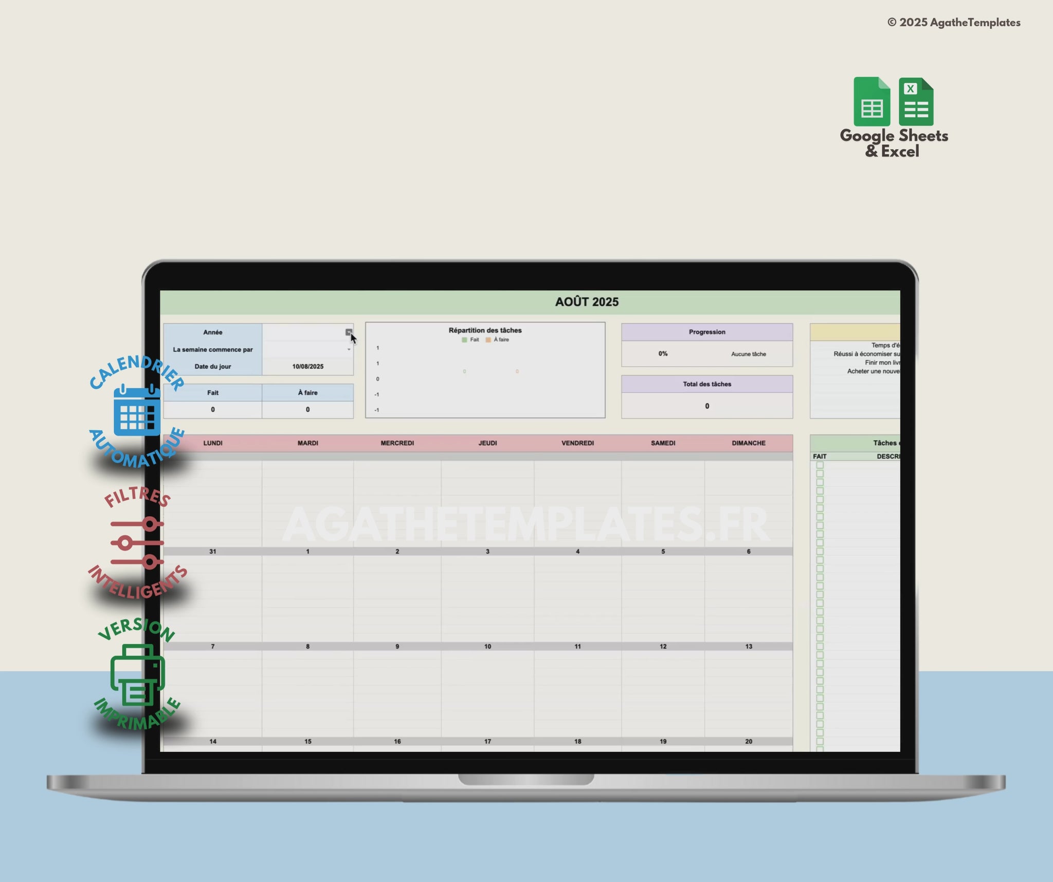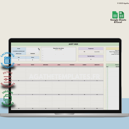 Ce fichier est conçu pour optimiser votre gestion des tùches et du temps grùce à un calendrier dynamique et intuitif. Planifiez, suivez et analysez vos activités mensuelles en quelques clics, que ce soit pour des projets personnels ou professionnels.