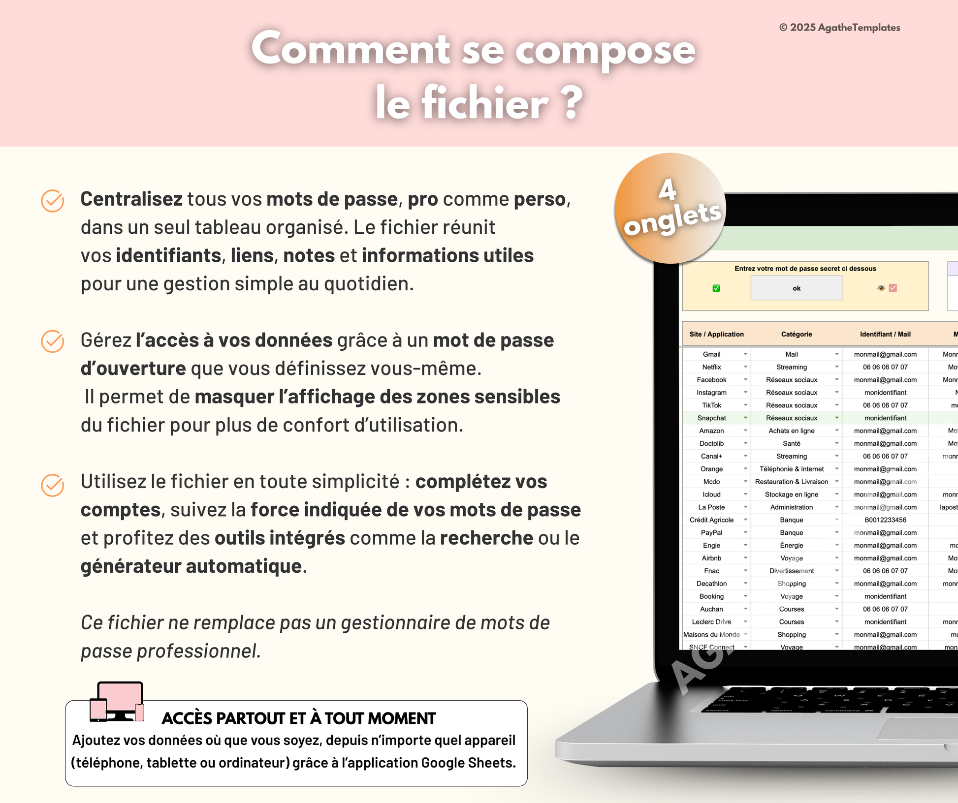 Ce fichier est un outil dâorganisation proposĂ© Ă titre informatif. Vous ĂȘtes seul(e) responsable de lâusage que vous en faites, de la gestion de vos donnĂ©es et de la sĂ©curitĂ© de vos mots de passe. AgatheTemplates ne peut ĂȘtre tenue responsable dâune perte, dâun oubli, dâun piratage, dâun accĂšs non autorisĂ© ou dâun quelconque incident liĂ© Ă lâutilisation de ce document.