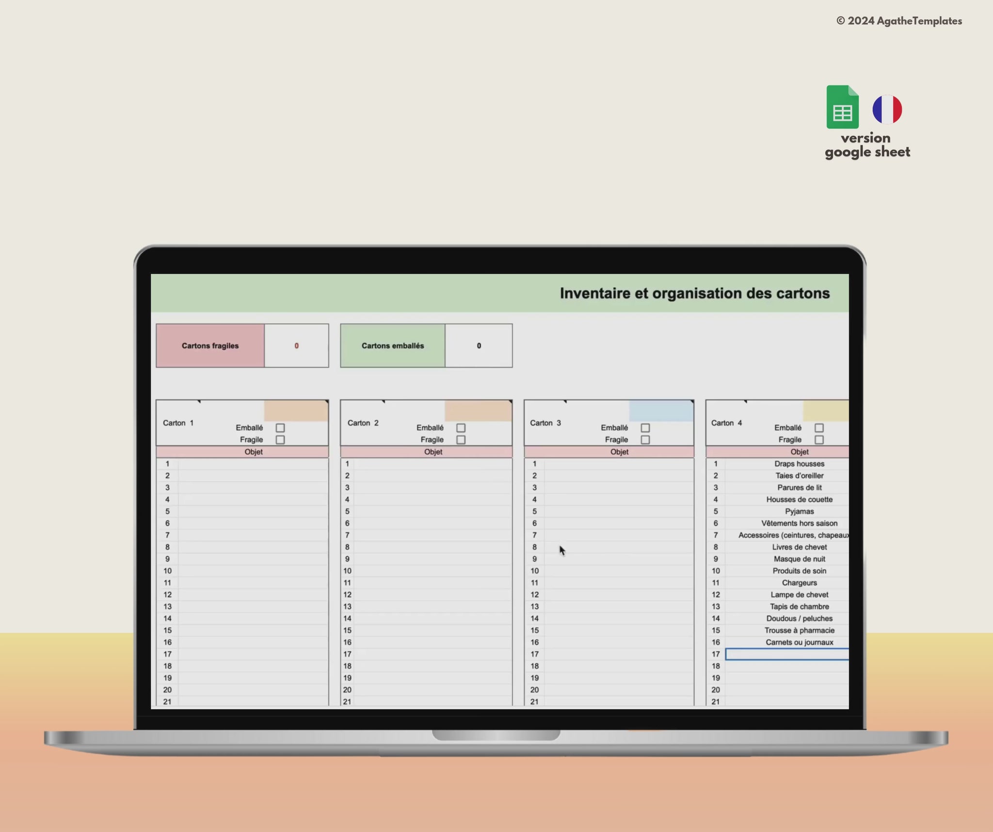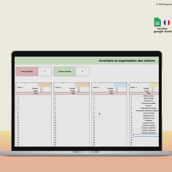 - Planning des cartons : Répertoriez jusqu’à 65 cartons, leur contenu, la pièce d’origine, et cochez s’ils sont fragiles ou emballés. Le fichier calcule automatiquement le nombre de cartons prêts et les pièces associées.