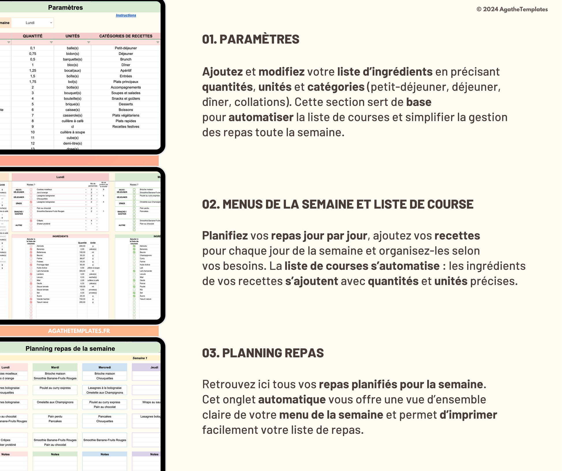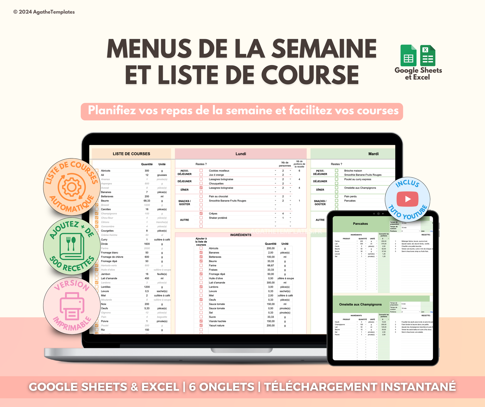 Ce fichier est conçu pour vous aider à planifier vos menus hebdomadaires tout en générant automatiquement votre liste de courses. Optimisez votre organisation en cuisine, gagnez du temps et simplifiez vos achats !
