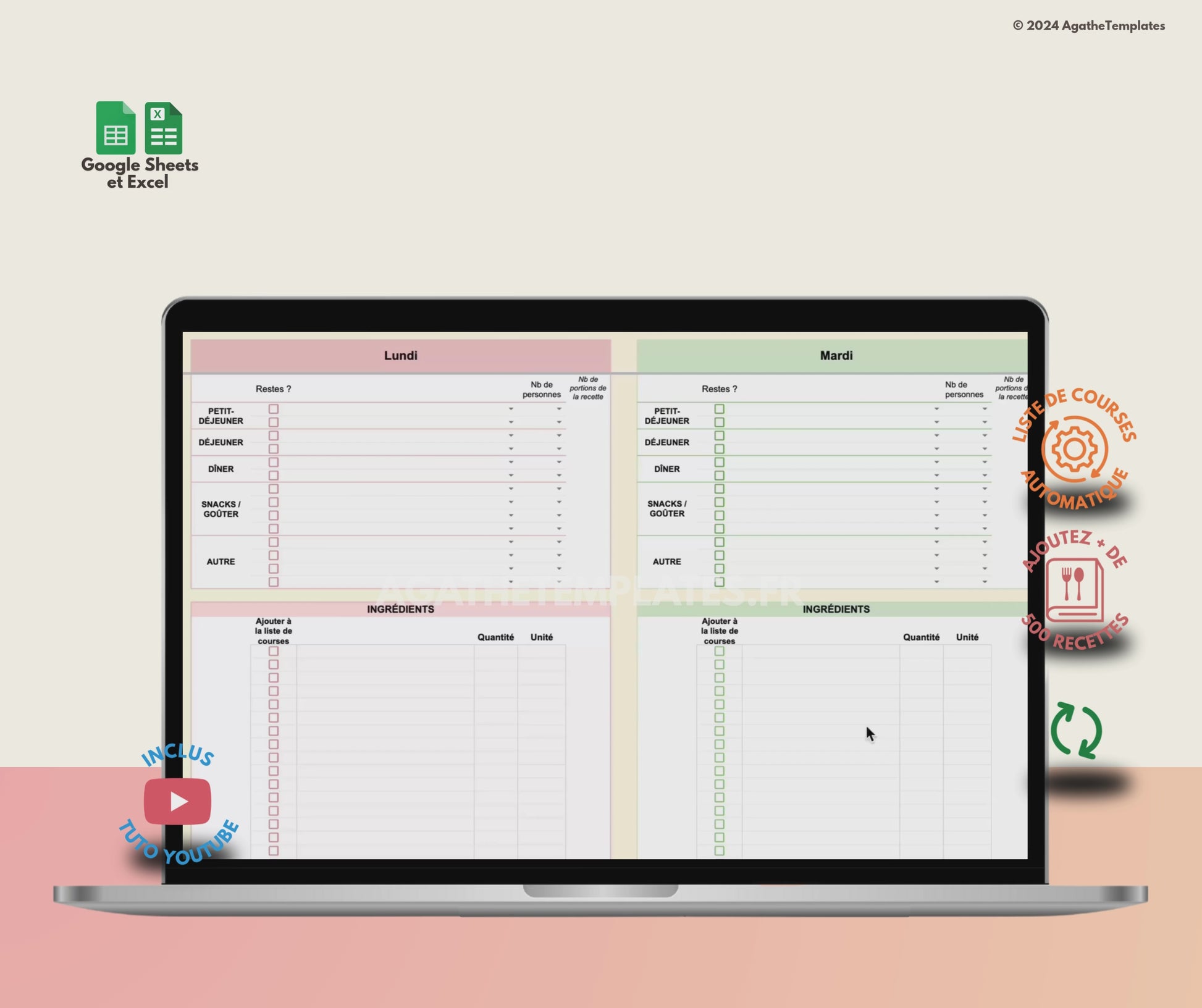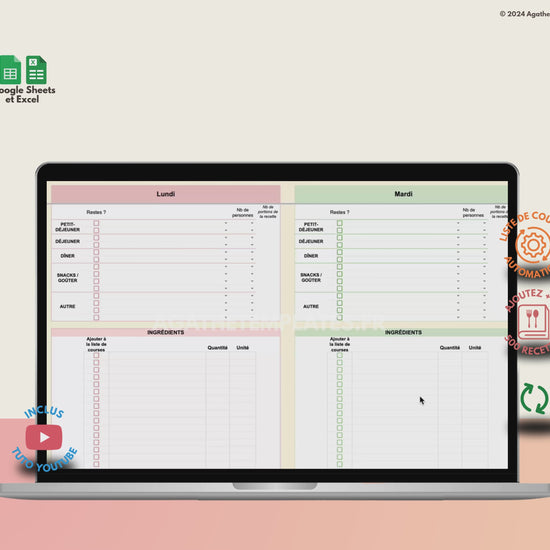 📁 Une démo Youtube du fichier : à retrouver ici (depuis, l'onglet "Planning repas" à été ajouté)