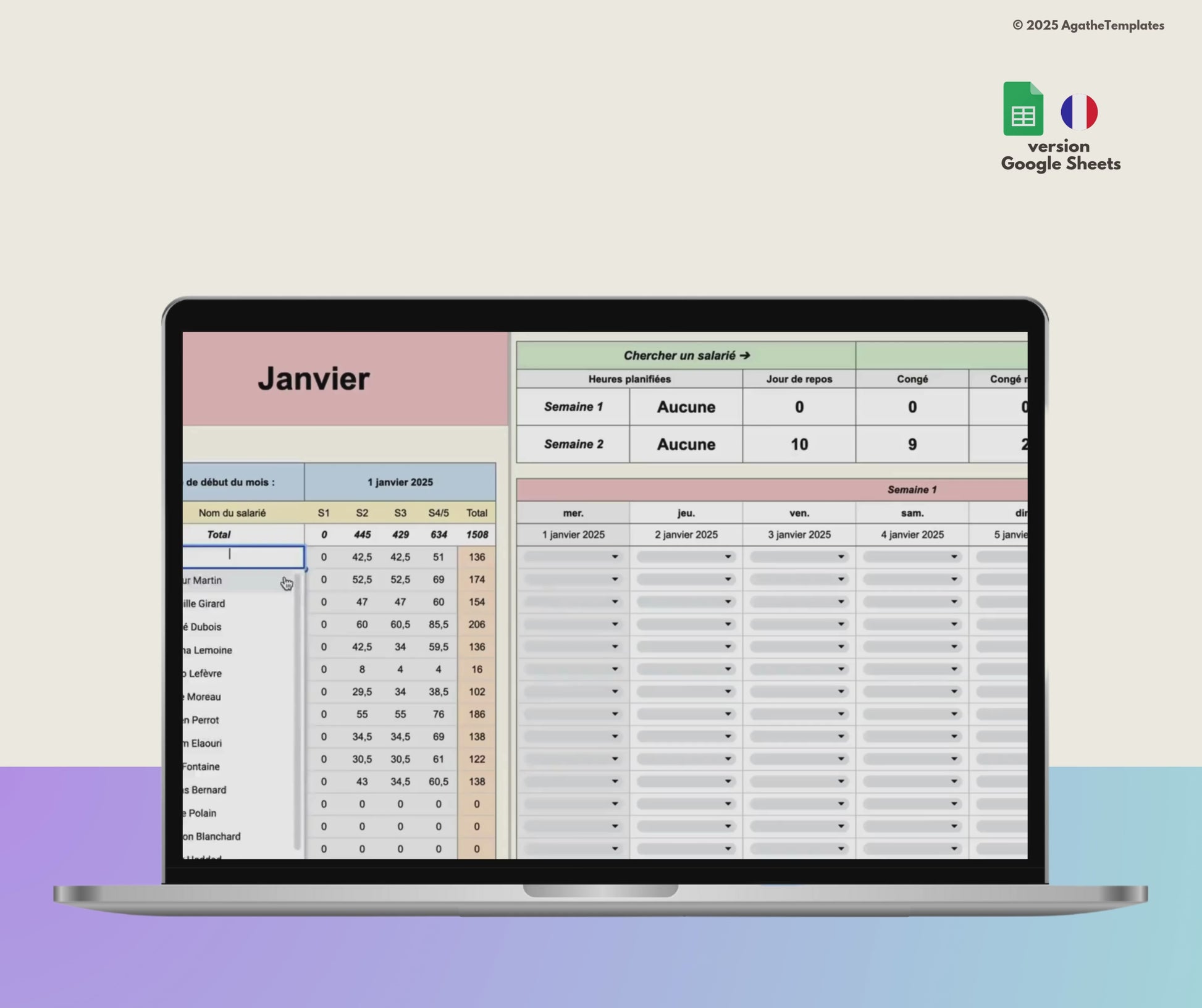 Adaptez les horaires, les noms de postes, les types d’absence ou encore les jours fériés selon votre structure. Aucune formule à toucher : tout est prêt à l’emploi.