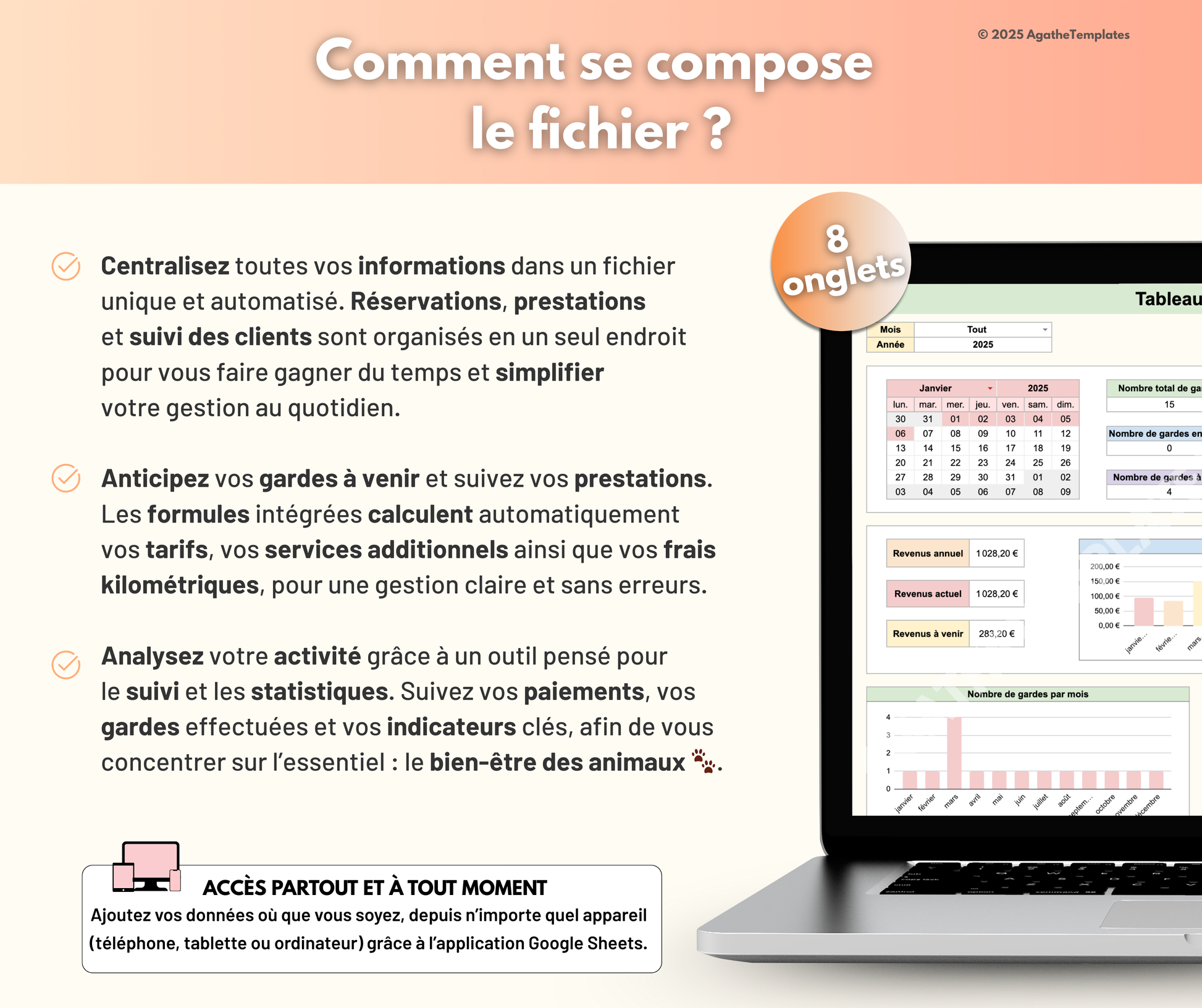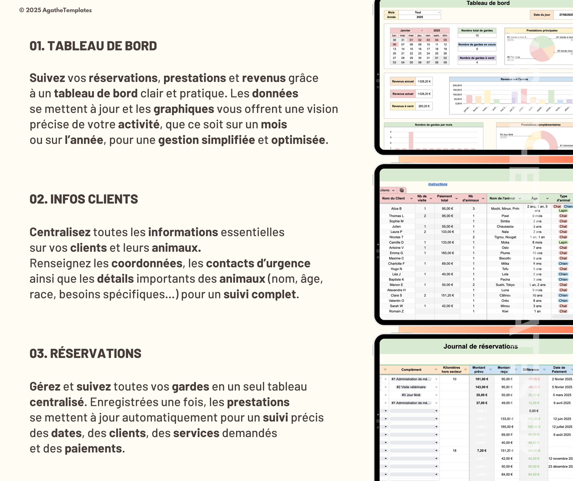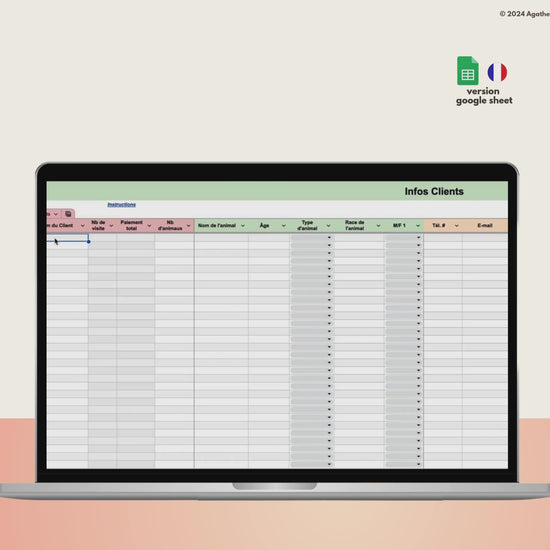 Ce fichier est conçu pour vous aider à organiser chaque aspect de votre activité de pet-sitting : gestion des réservations, suivi des clients, planification des prestations et suivi financier. Simplifiez votre organisation, gagnez du temps et offrez un service fluide et professionnel à vos clients !