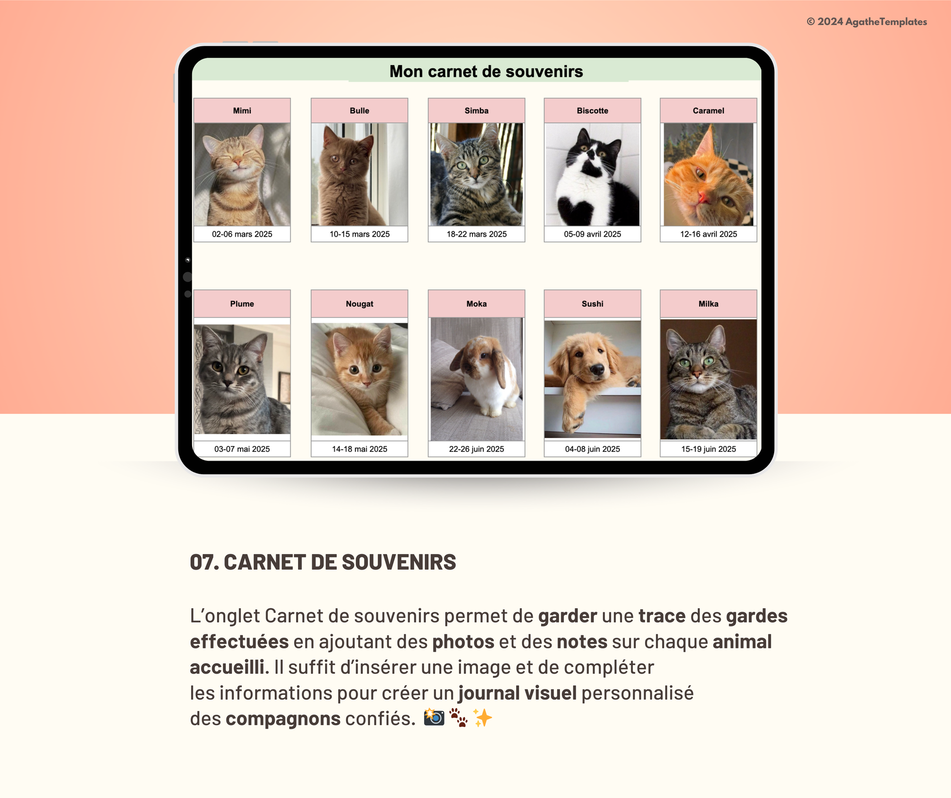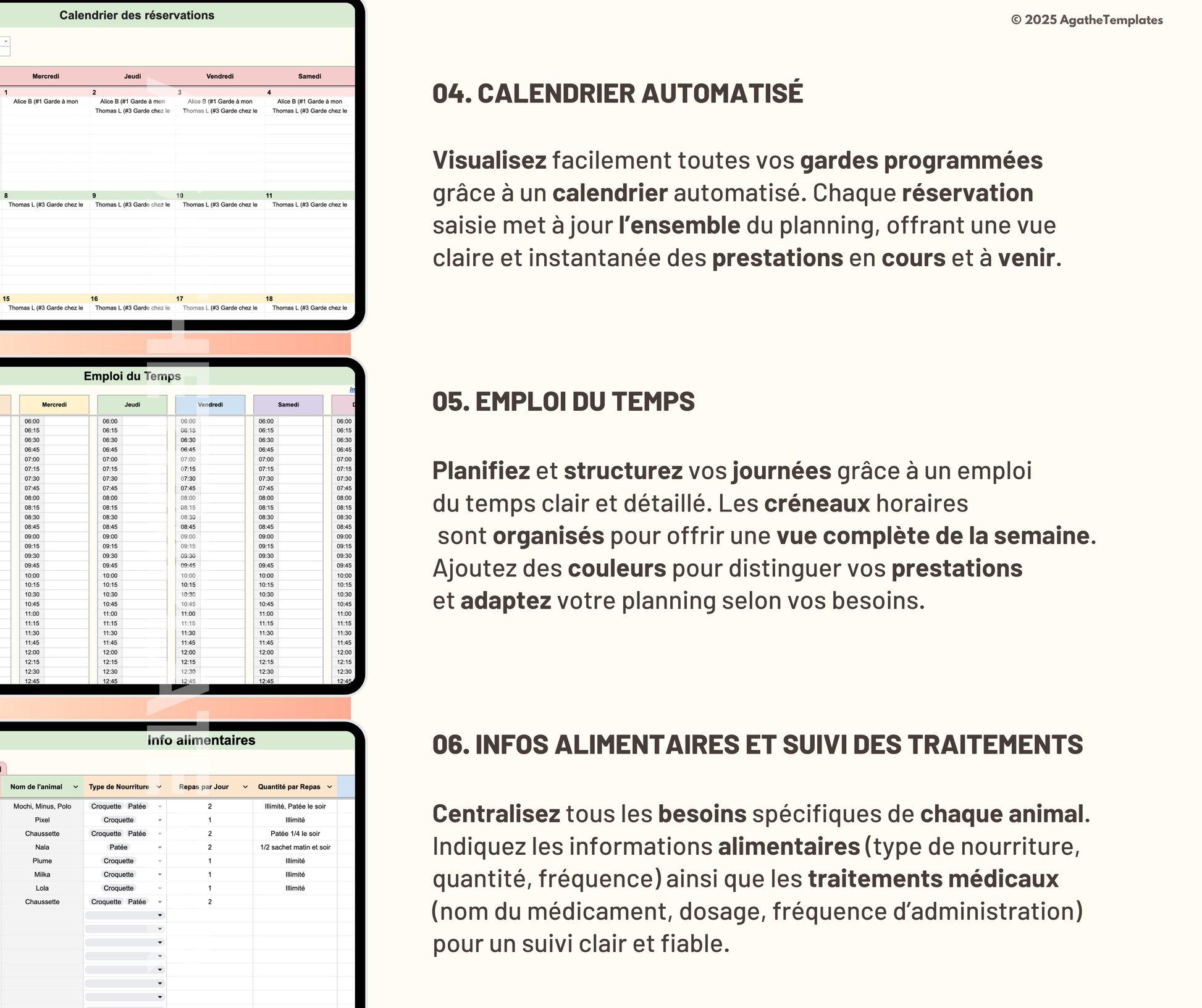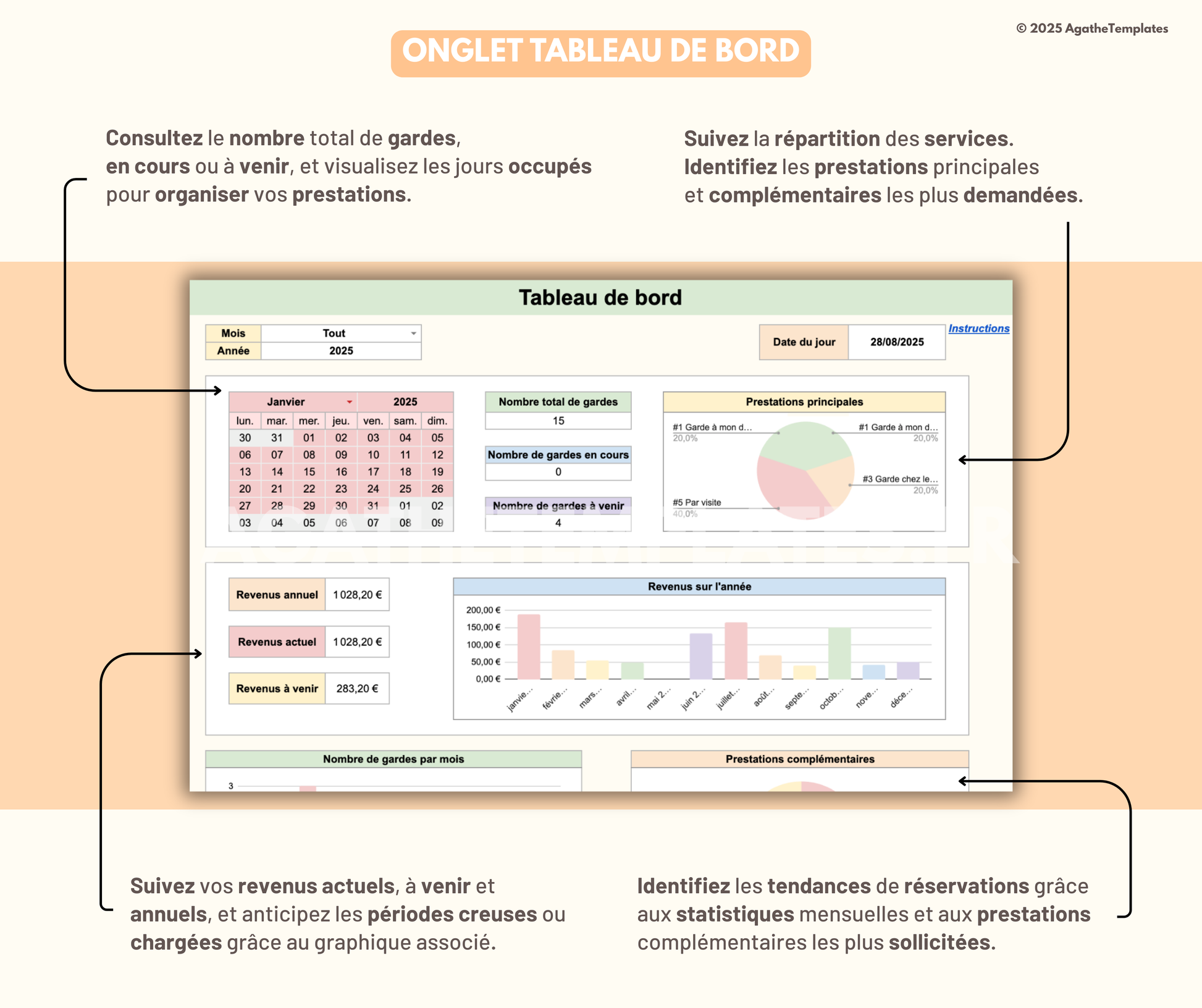 Ce fichier est conçu pour vous aider à organiser chaque aspect de votre activité de pet-sitting : gestion des réservations, suivi des clients, planification des prestations et suivi financier. Simplifiez votre organisation, gagnez du temps et offrez un service fluide et professionnel à vos clients !