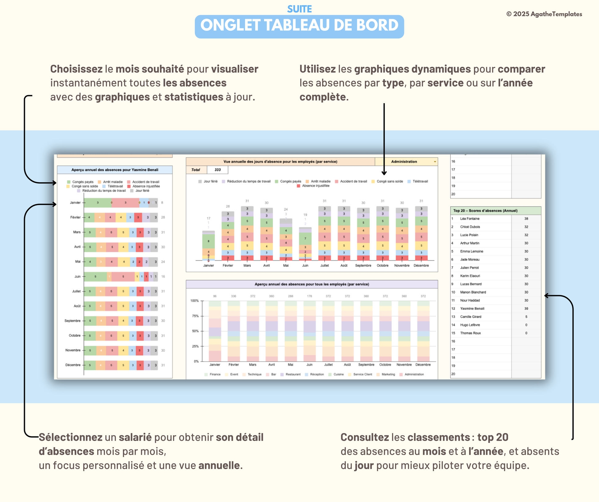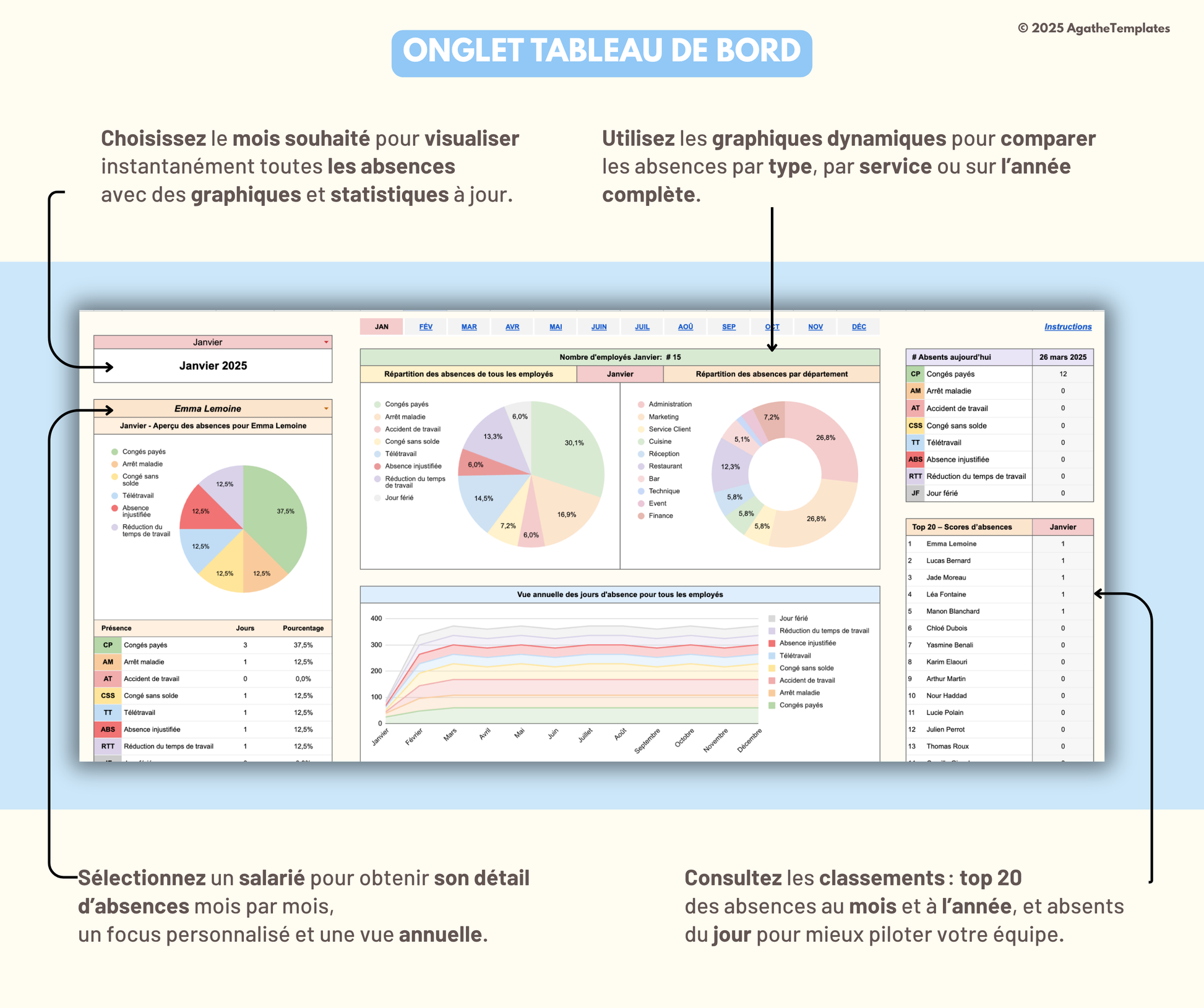 Suivez les tendances mois par mois, identifiez les employés les plus absents, comparez les services et visualisez l’ensemble de l’année grâce à des graphiques dynamiques. Un focus individuel est aussi disponible pour chaque salarié.