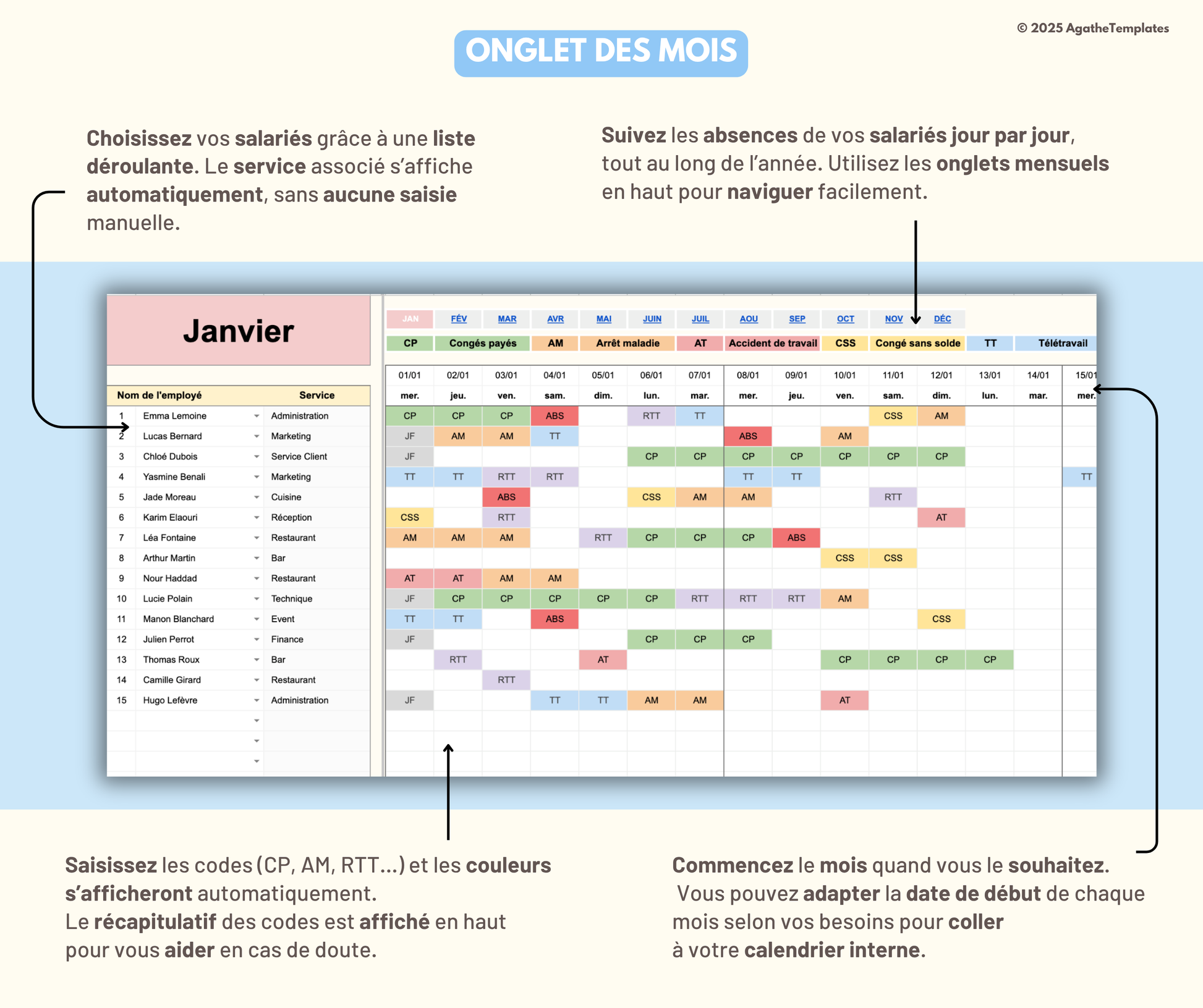 Modifiez les codes d’absence, les couleurs, les services, les noms… Le fichier s’adapte à votre organisation. Vous pouvez même choisir la date de début de chaque mois pour suivre des périodes spécifiques.