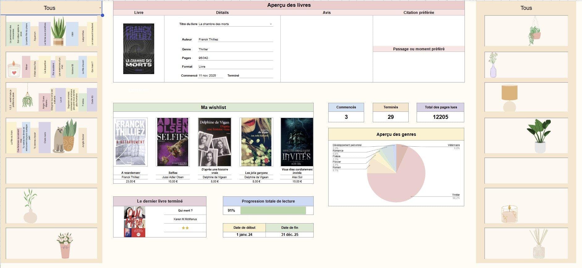 đ Suivi des lectures : Notez vos livres avec toutes les informations essentielles : titre, auteur, genre, nombre de pages, statut (commencĂ©, terminĂ©, prĂ©vu) et mĂȘme vos citations et moments prĂ©fĂ©rĂ©s. Ajoutez facilement une image de couverture et laissez le fichier calculer automatiquement votre progression globale.