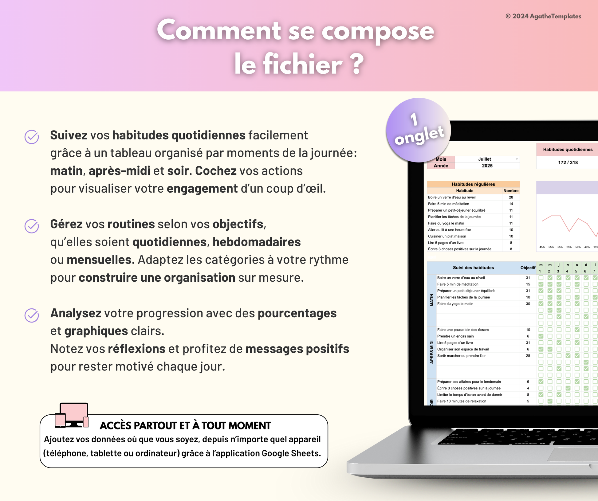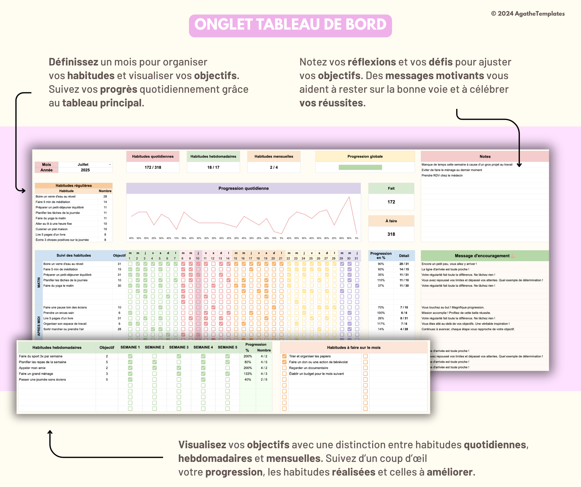 Cette feuille vous permet de suivre vos habitudes jour aprĂšs jour avec des outils clairs et motivants :