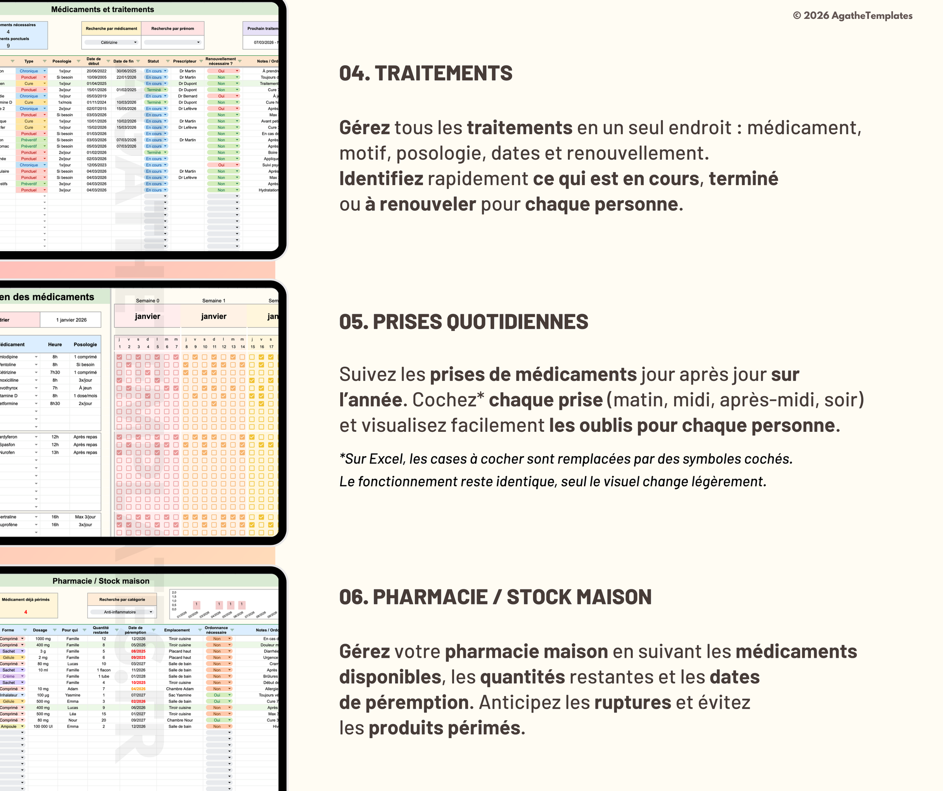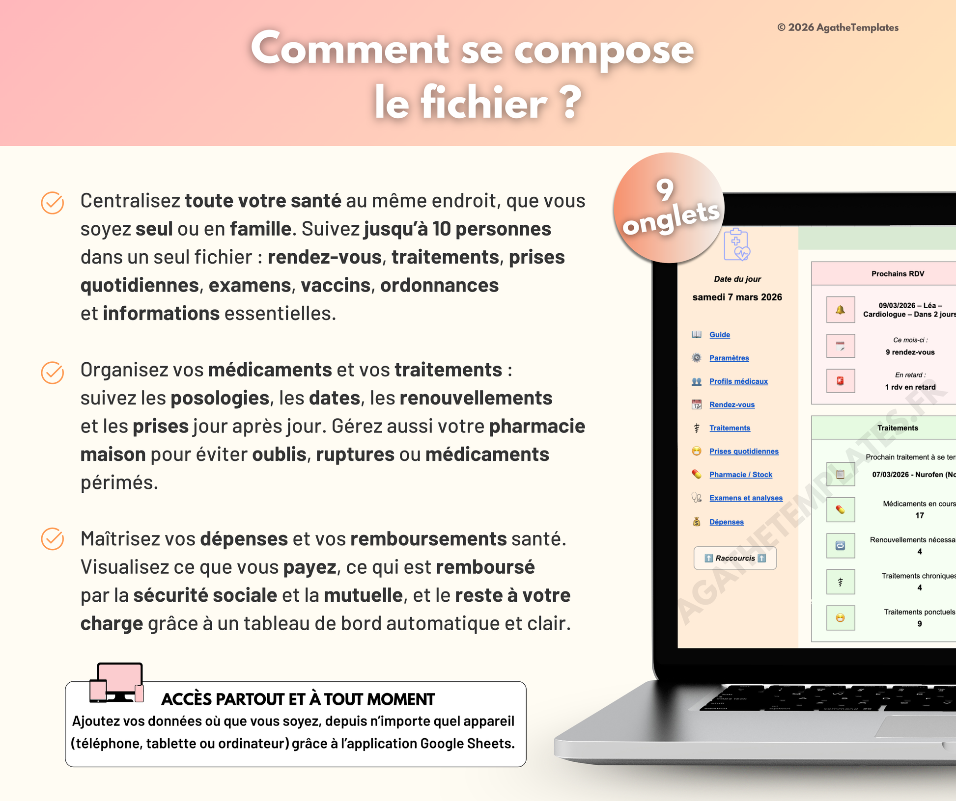 Que vous soyez seul, en couple ou en famille, ce fichier vous permet de gĂ©rer jusquâĂ 10 personnes au mĂȘme endroit : rendez-vous, traitements, mĂ©dicaments, examens, vaccins, dĂ©penses et remboursements !