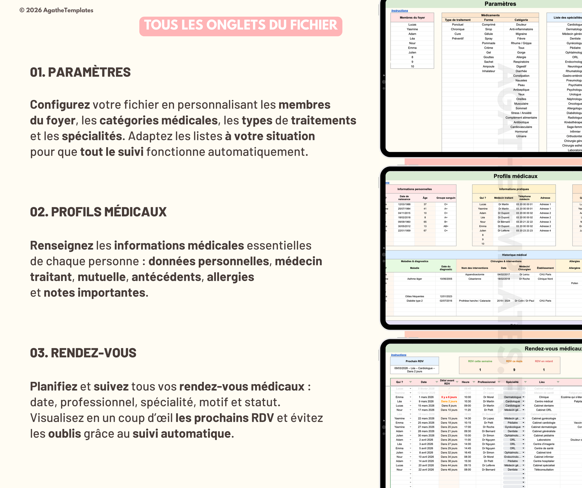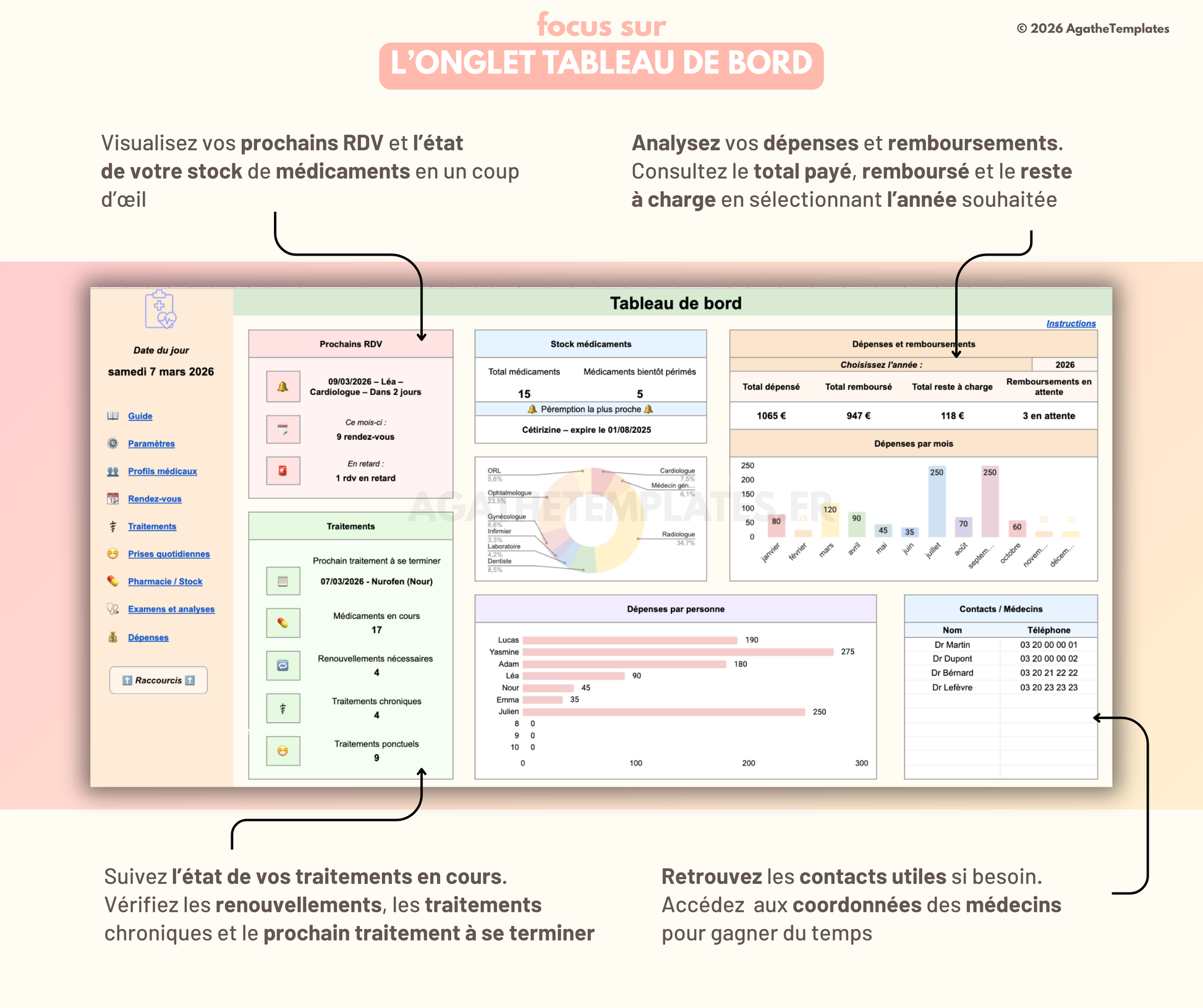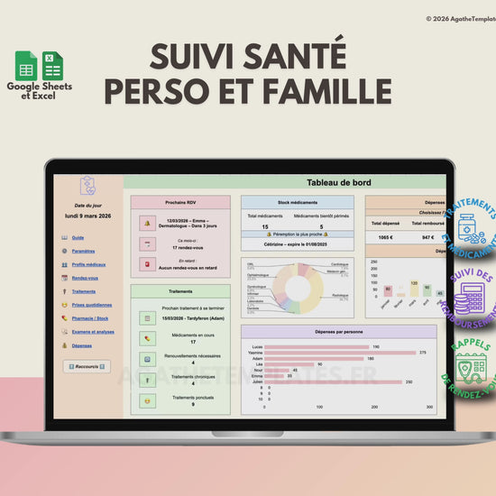 âïž ParamĂštres : personnalisez le fichier selon votre situation (membres du foyer, catĂ©gories mĂ©dicales, types de traitements, spĂ©cialitĂ©sâŠ). Cette base alimente automatiquement les autres onglets.