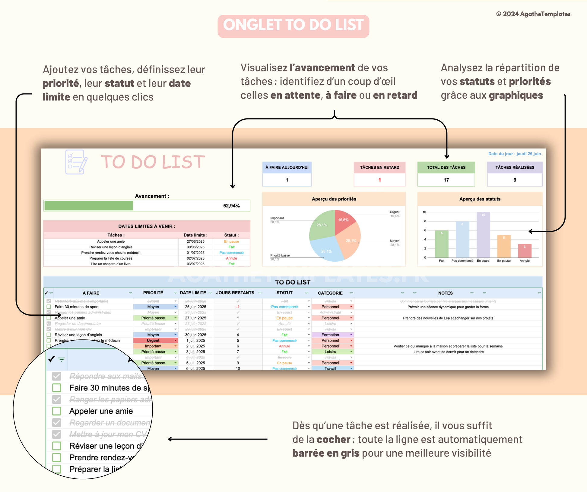 đ To-Do List : Cette page regroupe toutes vos tĂąches avec des informations clĂ©s telles que les prioritĂ©s, dates limites, statuts et notes. Chaque Ă©lĂ©ment est conçu pour faciliter la planification et le suivi :